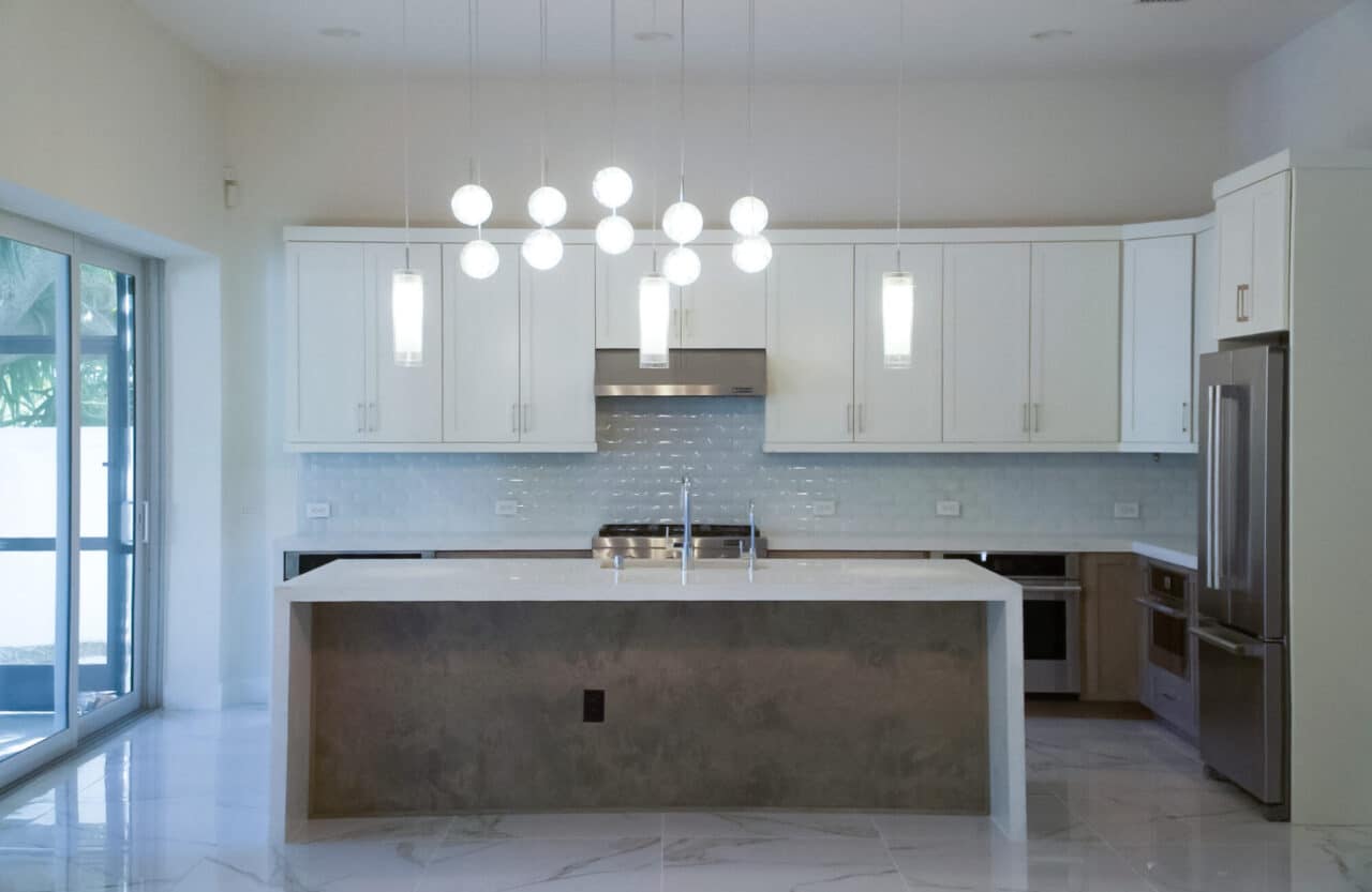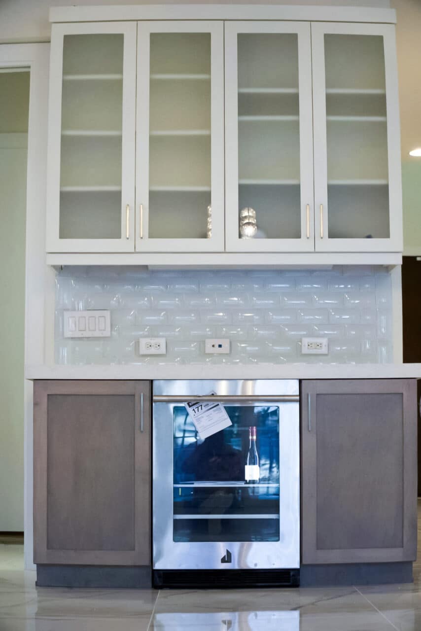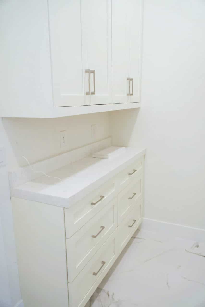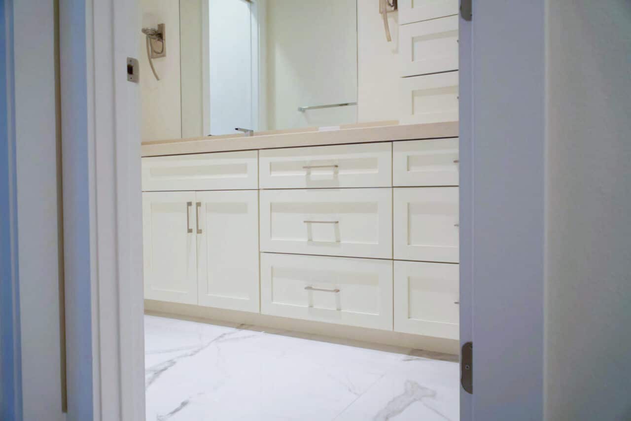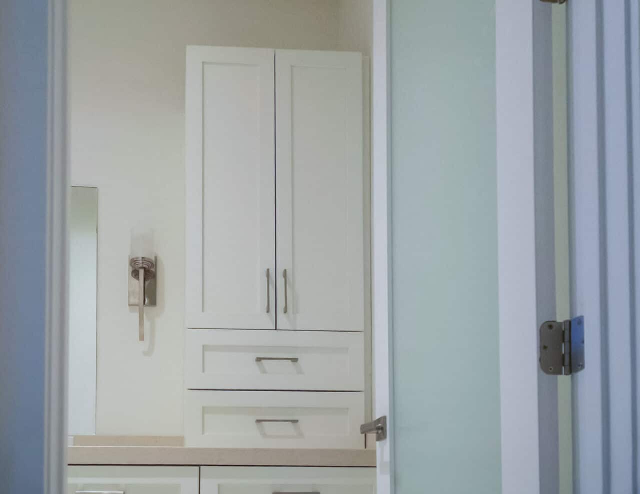 - All of the countertops were preserved and reinstalled. New lower cabinetry: On this project, the client decided to do the same white shaker in the bathroom and mud room, but in the kitchen, we matched the stain on the oak stairs to maple cabinets, giving the kitchen a beautiful contrast.