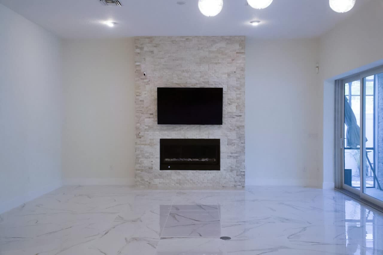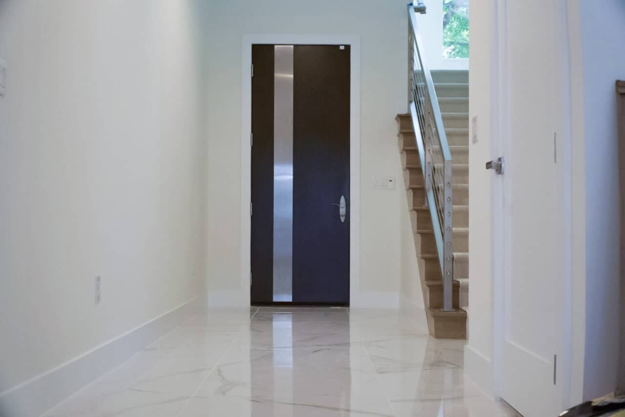 - On this project, we tore out the original glued-down engineered hardwood and leveled the area before laying down large-format porcelain tile.